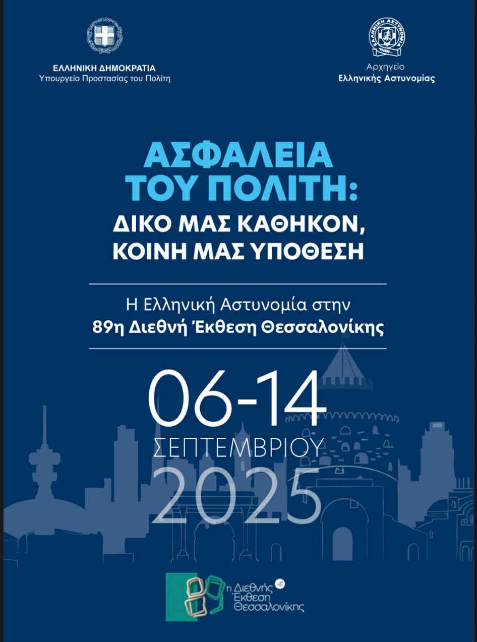 Με σύνθημα την ασφάλεια του πολίτη και με πιο διαδραστική παρουσία από ποτέ, η Ελληνική Αστυνομία συμμετέχει φέτος στην 89η Διεθνή Έκθεση Θεσσαλονίκης. Από τις 6 έως τις 14 Σεπτεμβρίου,